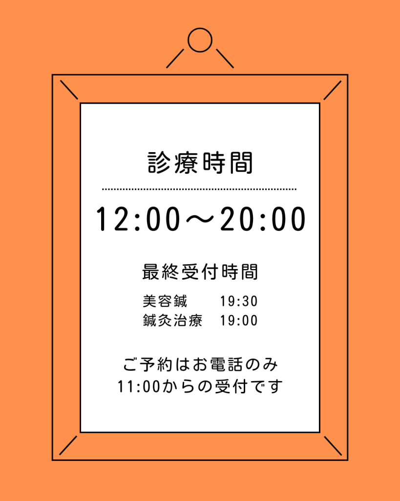 美容鍼の最終受付時間 19:30お体の治療の最終受付時間 19:00