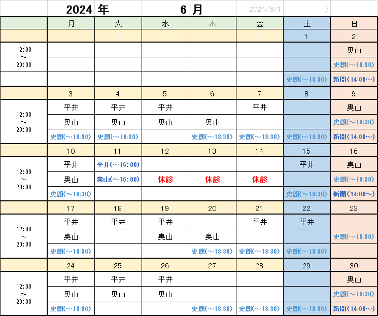 2024年6月の鍼灸師シフトに変更がございます。
