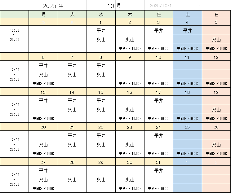 2025年10月の鍼灸師シフトです。